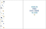 Greeting card with envelope, embellished with foil. "Wishing you peace love & light this season"
