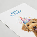 Make someone's birthday extra special with this adorable greeting card, featuring an illustration of a Goldendoodle dog wearing a birthday hat. Each handmade card is printed on recycled paper that has a luxurious and uniquely textured feel. Great for gift shops, pet stores, and bookstores! Greeting card size: A2 (4.25 x 5.5 inches). Includes envelopes, blank inside. Printed on FSC Certified 80 lb watercolor textured cardstock, made from recycled materials & renewable energy.
