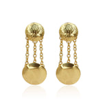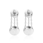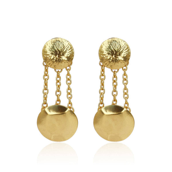 Pendant earrings featuring two textured coins linked together by three thin chains. Materials: Sterling silver-plated pewter. Nickel free. Measurements: 2"L x 7/8"W Earring closure: Post back