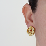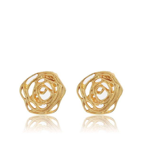 Swirling rose cut-out stud earrings. This delicate medium size earring is designed to lay flat upon the ear. PRODUCT DETAILS Materials: Pewter alloy base plated with 24-kt gold / sterling silver. Measurements: 0.75" long Earring closure: Post back MSRP: $34