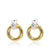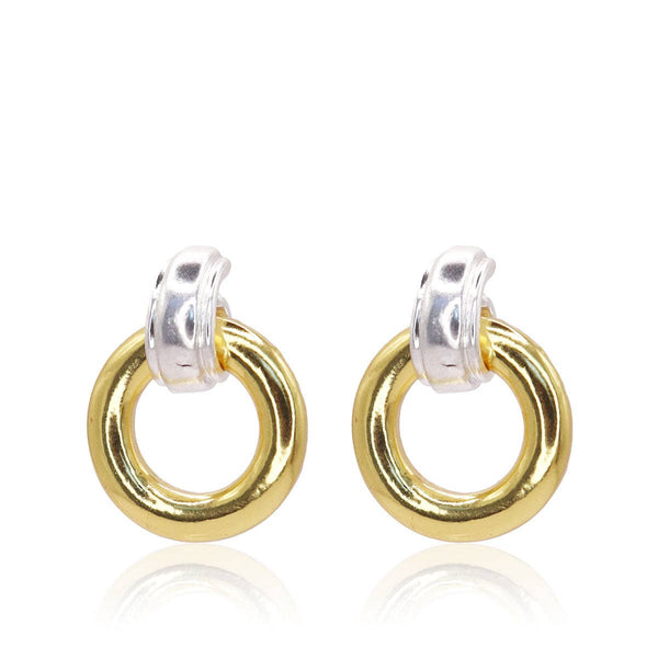 Gold polished cut-out circle earrings linked to a small silver ring. Materials: 24-kt gold-plated pewter. Nickel free. Measurements: 1.5"D Earring closure: Post back