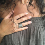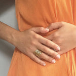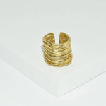 This highly visual ring of brushed gold ribbon adds a unique, personal touch to any hand. Give it as a gift to oneself or present it to a deserving other -- it's perfect for those occasions when you're searching for something truly special. Product details Materials: Pewter casting plated with 24 kt gold plating / Sterling silver plating. Measurements: 0.75" wide.
