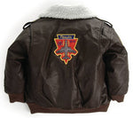 It features nine colorful patches on the front, back and sleeves, and includes an airplane zipper pull, and four pockets including two that snap. There is a Sherpa collar, ribbed cuffs and waistband, snap epaulets, and a military map lining. It is made of imitation leather, and can be cleaned by wiping with a wet cloth and mild soap.