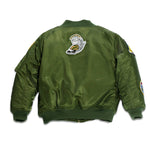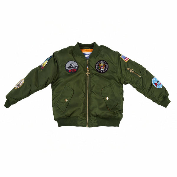 It features seven patches on the front, back and sleeves, and includes an airplane zipper pull. There is even an orange lining used by pilots in case of emergency. The jacket has knit cuffs and waistband, two snap pockets plus a zippered sleeve pocket, and a place to hold four writing instruments. It is made of water resistant nylon twill material, and is washable.