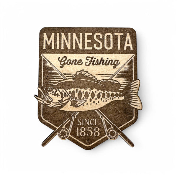 Minnesota Made • Recycled/Recovered Wood This badge design is for all fishing enthusiasts! Namedrop to your location with low minimums and zero design fees. Measures: 2.4 x 2 inches Thickness: 1/8mm Ceramic Magnet Back