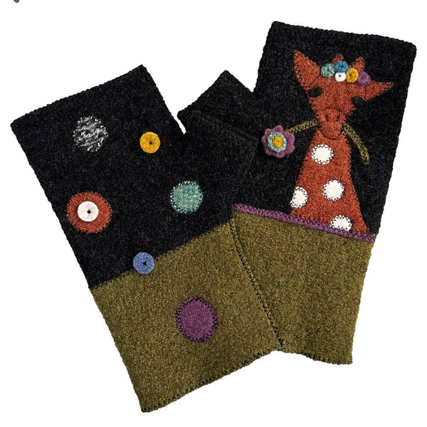 100% Wool fingerless gloves. Made in Minnesota. One size fits most with fun designs. Great gift!