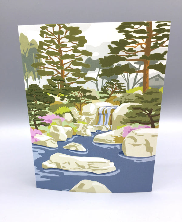 A peaceful walk through the Charlotte Partridge Ordway Japanese Garden leads you to a small rock waterfall and to the tea house in the background.