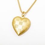 Be still my checkerboard heart! The matte gold-plated checkerboard Amanda Locket Necklace is a funky spin on the traditional heart locket. The pendant measures 3/4" and comes on a matte gold box chain with a silicone slider clasp, wearable up to 26" inches.