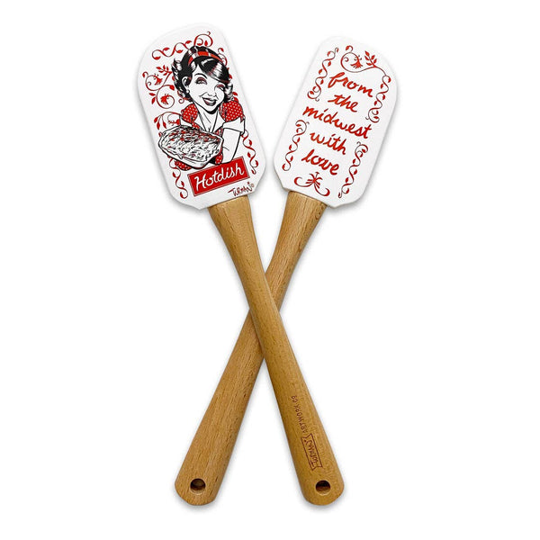 From the Midwest with love. . . Silicone spatula printed on each side: hotdish design on one side and “from the Midwest with love” on the other-perfect for mixing, folding, serving, spreading and flipping. The top corner is angled to fit in tight spots and to get every last drop-solid beechwood handle, the design will not fade-comes apart for the cleaning-silicone top is dishwasher safe, handwashing is recommended for the handle. A great partnership with a great Minnesota brand talisman design.