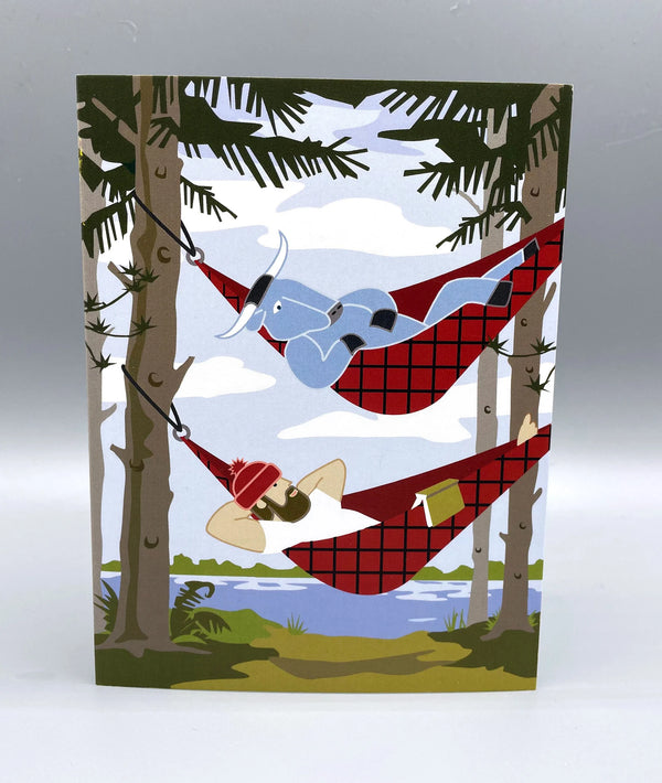 Paul Bunyan and Babe, his blue ox, love to relax in hammocks by the lake in the summer.