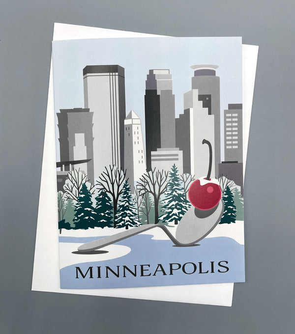 Minneapolis is beautiful in a coat of white during the winter. Cindy Lindgren added some of their favorite buildings and landmarks in this illustration.
