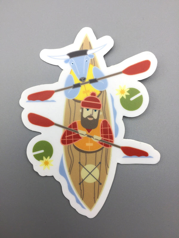 This vinyl sticker features Paul and Babe enjoying the lakes and rivers of Minnesota with their wooden kayak. I imagine they carved it themselves. Dress up your water bottle, journals or lap top. The vinyl is waterproof with a strong bond but still removable.