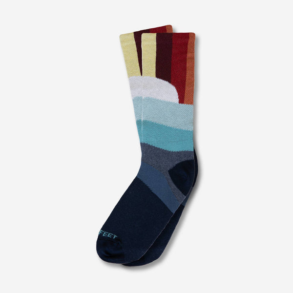 These medium-weight crew socks are knit with eco-friendly recycled cotton and feature all the colors of the most magical sunset. Cool blues at the base of the socks, with a half sun at the center, followed by warm colors up the calf.