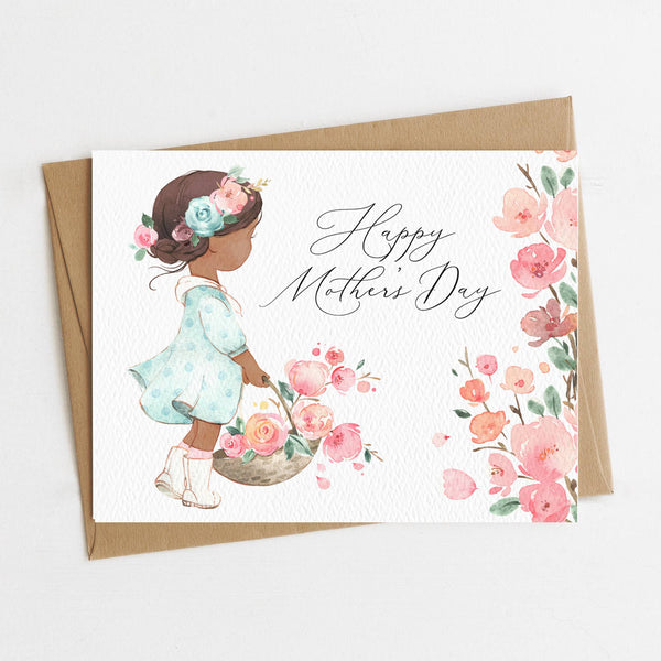 Mother's Day greeting card, featuring a watercolor illustration of a little girl with flowers. Perfect for gifting to Mom or Grandma, from her daughter or granddaughter. Each handmade card is printed on recycled paper that has a luxurious and uniquely textured feel.