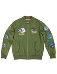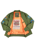 Lightweight, comfortable, and perfect to wear in cold weathers. The outer shell is waterproof and the inside has an orange 100% satin polyester lining to keep the cold out. The jacket features a full length front zip closure, two front slash pockets with flap & snap closure, a zippered utility pocket, an interior slip pocket, rib-knitted cuff, collar, and hem. Complete with an array of vintage-style embroidered patches on both sleeves, chest, and back.