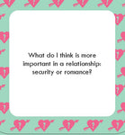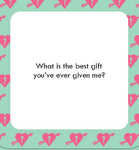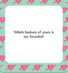Test which partner knows the other best with this romantic addition to our After Dinner Amusements series! Pull one of these 50 flirty question cards to see if your special someone has been paying attention and relive romantic memories together. Questions include: * Would I rather spend a date night out or a date night in? * True or false: I love spicy food. * Who is my celebrity crush? * What feature of yours is my favorite? * Would I rather have a beach vacation or a ski vacation? * What are the first names of my parents? This fun and frisky game is sure to spark conversations, gift ideas, date nights, and more. 50 PROMPTS FOR COUPLES: This deck of flirty and playful questions is the perfect game for couples to connect, get inspired, and share some laughs.