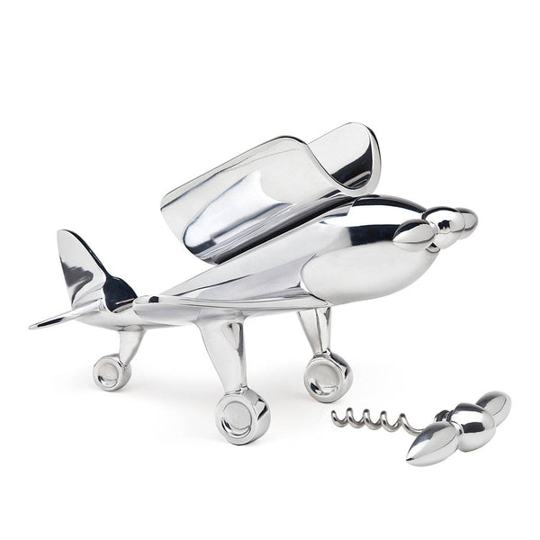 This stainless-steel airplane-shaped bottle holder boasts a covertly tucked away corkscrew, revealed when its propeller is detached. This is an ideal piece for the wine connoisseur with an eye for the creative, making a lasting impression on any occasion.