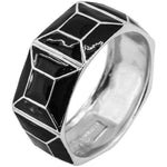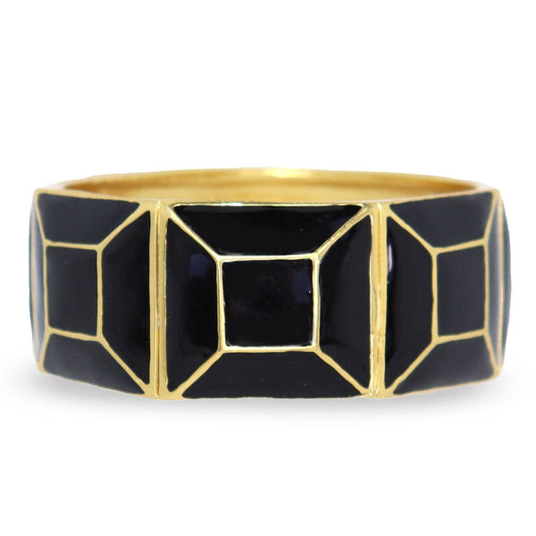 Large bangle featuring a baroque square design. PRODUCT DETAILS Materials: Pewter casting with 24 kt gold plating / Sterling silver plating / Rose gold plating. Enamel Measurements: 7.5 " inner circumference; 1.5" wide.