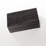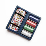 A classic game in a contemporary case. Carry your poker set in this custom black croco leather or blue ostrich leather case. Box features chips in four colors, 25 pieces of each and 2 decks of playing cards.