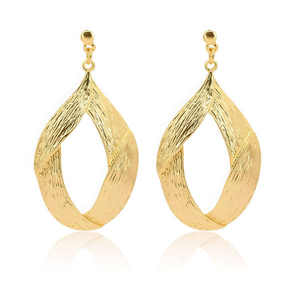Gold open teardrop design pendant earrings with a small and simple bauble stud and brushed texture. Materials: 24-kt gold-plated pewter. Nickel free. Measurements: 2.5"L x 1.25"W Earring closure: Post back Earring Weight: 0.22 oz. (Lightweight)