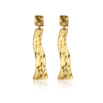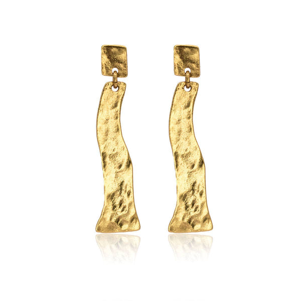 Gently hammered swirling dangle on a square stud in antique gold finish. Discreet and elegant.