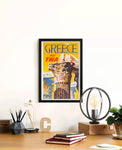 A 1960s travel poster promoting travel to Greece via TWA. This is a high-quality print from the original vintage poster. Photographed in high-resolution using our signature capture process to retain all visual marks and tears as found on the original copy. Made in NYC. Printed in full color on matte smooth art paper. Print size is 12×18″, available framed or unframed. Our small prints are printed on digital press with archival matte off-white paper are displayed flat in crystal-clear sleeve and a rigid acid-free backing. Our poster frames are made of solid pine wood with a matte black finish. Featuring shatter-free thick plexiglass and a sawtooth hanger for easy hanging. Frames ship protected in heavy-duty bubble wrap.
