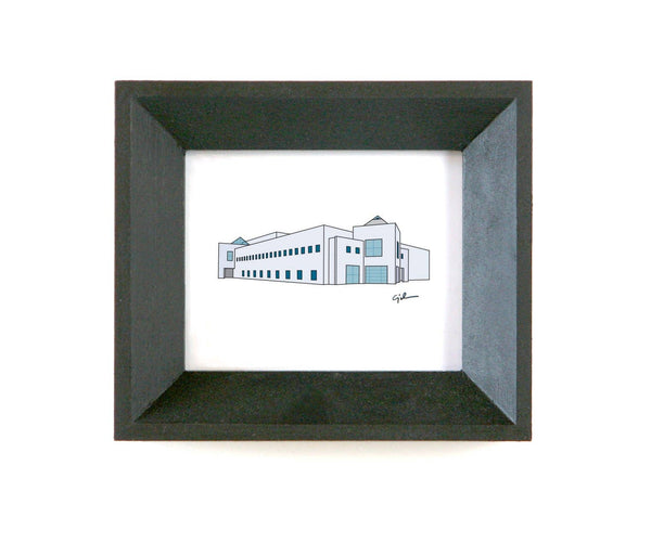 Do you love Paisley Park? Honor it by displaying our State Icon that features the popular Minnesota landmark. The framed digital illustration celebrates the modern home and recording/production studio that Prince built in the 1980s in Chanhassen. After his death in 2016, the private estate became a museum that celebrates the iconic rocker's life and legacy. This little keepsake was drawn with a mouse and printed in our studio. It's finished in a handmade, hand-painted, black wood frame, and is protected by recycled glass.