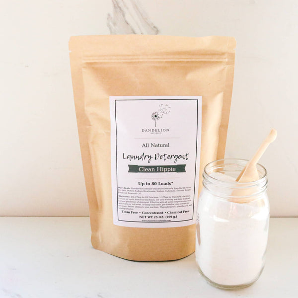 Dandelion Naturals Laundry Soap Powder is effective & safe for the whole family to use; a great option especially for those with sensitive skin. Not only will this natural soap clean your clothes well, it will also leave them smelling fresh, clean, & naturally soft. We start by shredding our very own handmade Laundry Bar of Soap & then we add 3 earth-derived, all natural, effective ingredients. We offer an unscented option as well as 4 scented varieties that are scented with pure essential oils only. 4 scent options available: Sunshine (Citrus Blend), Clean Hippie (Patchouli), Eucalyptus, & French Lavender. For stubborn stains, try our All-Natural Stain Stick. Directions: For HE Machine – 1/2 Tbsp for small load, 1 Tbsp for large load. For Standard Machine – 1 Tbsp for small load, 2 Tbsp for large load. Ingredients: Sodium Cocoate, Sodium Bicarbonate, Sodium Carbonate, Sodium Borate, Essential Oils. No Artificial Fragrance, Dyes, Phthalates, Parabens, Preservatives, Phosphates.