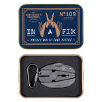 Multi-Tool pliers included screwdriver, bottle opener and saw. Titanium finish. Packaged in an illustrated tin.