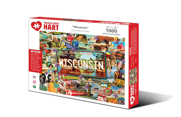 One of the nation's leading dairy producers, known as "America's Dairyland", Wisconsin is the 23rd-largest state by total area and the 20th-most populous. Inhabited by Algonquian and Siouan nations, European settlers entered the state, many of whom emigrated from Germany and Scandinavia. So, come visit, put on your cheese-head hat, have a brewski and check out the Brat Days in Sheboygan. Go Packers! And enjoy this 24"x 30" 1000 piece puzzle. By Kate Ward Thacker
